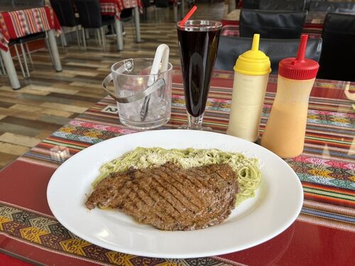 名鉄西尾線の西尾駅にやって来たわ! この駅の近くにガチのペルー料理屋があるからって連れて来られたわ! それでそのお店どこにあるのかしら? 『デュナス』に行って来たわ! メニュー Chicha Morada(チチャモラーダ) Tallalin Verde c/ Bistec a la Plan…