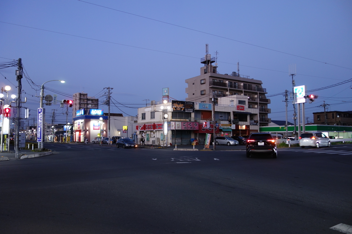 反対車線へ渡ると、正面に白い2階建ての建物(加藤駅前ビル)が見えてまいります