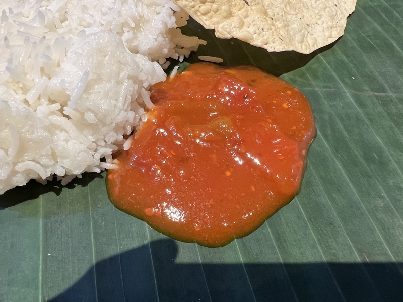 サンバルには、豆の香ばしさと野菜の旨みがあって、ほんのりとトマトの酸味のある優しい味付けだったわ!