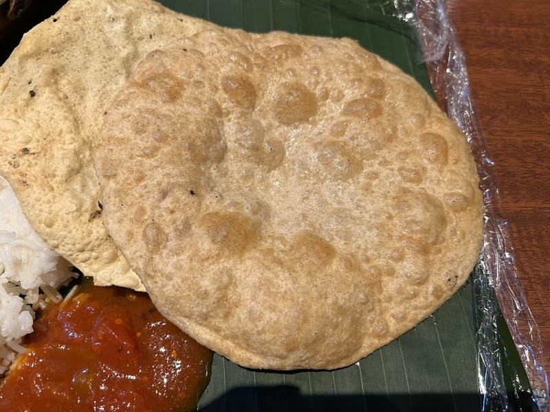 その次にカレー、副菜、サンバル、プリと一つずつ持ってきたわ!